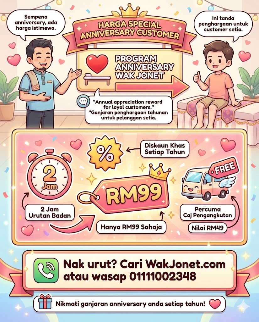 ✅ Sempena hari anniversary perkahwinan dapat DISKAUN special RM99.00 2 jam Urutan Badan Wak Jonet, Ada 4 isteri boleh claim 4 kali setahun. PERCUMA caj transport.