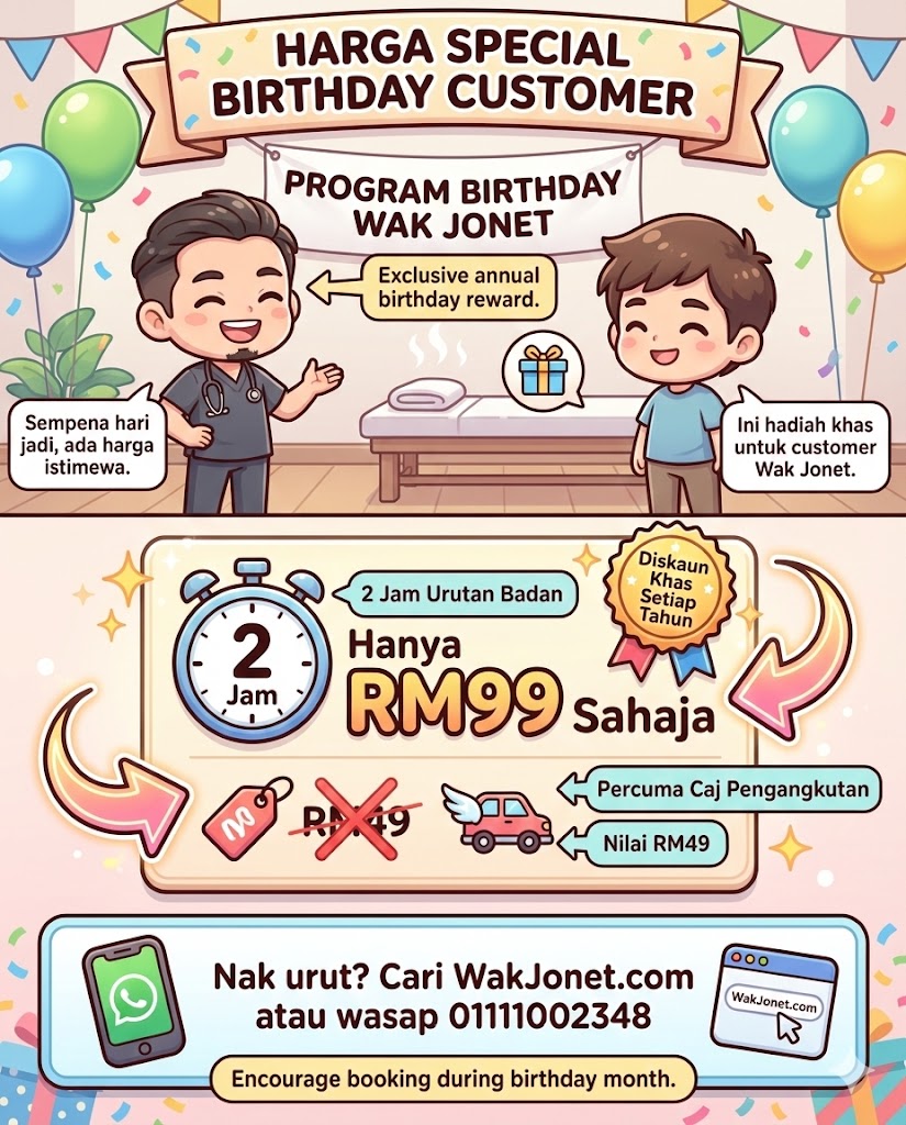 ✅ Sempena hari jadi customer akan dapat diskaun untuk Urutan Badan Wak Jonet 2 jam hanya RM99 sahaja.