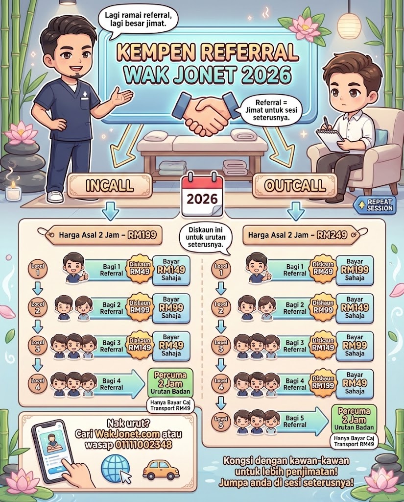 ini sudah berjaya dapatkan sesi urutan badan dalam bulan yang sama dengan Wak Jonet baru boleh redeem offer Wak Jonet Referral Program.